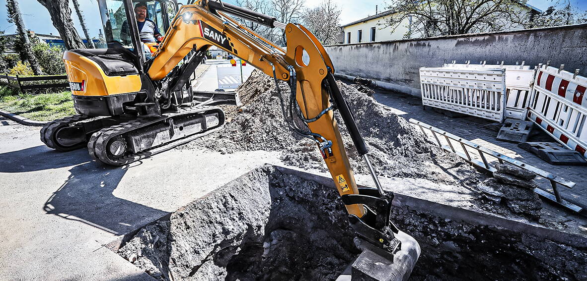 Hinten machen wir’s ganz kurz – Aushubarbeiten in der Nähe von Hindernissen? Mit dem SANY SY50U kein Problem. Mit dem kompakten Kurzheckbagger genießen Sie höchste Beweglichkeit, und das bei uneingeschränkter Rotation.